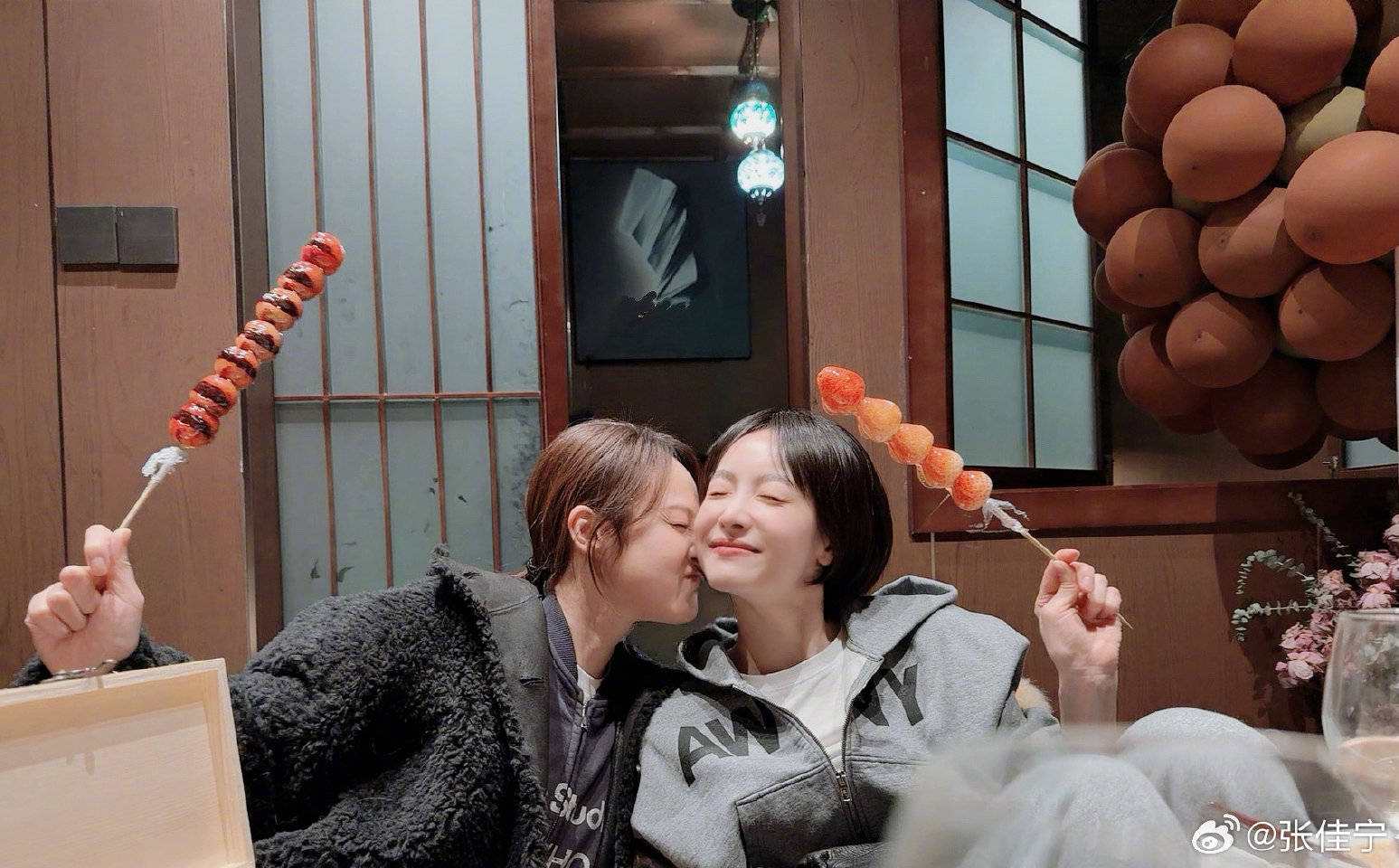 两人一人提溜着一串糖葫芦,桌上满满的美食,倒是一点不为减肥烦恼,对比蒋欣顿顿白菜萝卜的真是太幸福了,从两人的穿着打扮就知道,张佳宁这次的探班应该还在剧组住了好几天,衣服都换了几套了。