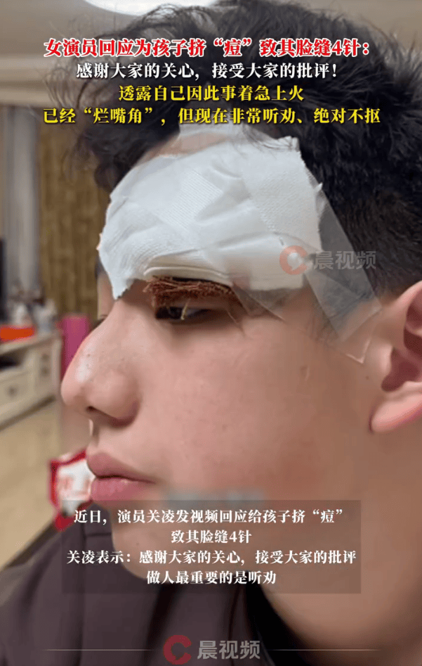 近日,演员关凌发视频回应给孩子挤“痘”致其脸缝4针。关凌表示:感谢大家的关心,接受大家的批评,做人最重要的是听劝,自己因此事着急上火已经“烂嘴角”,但现在非常听劝、绝对不抠。