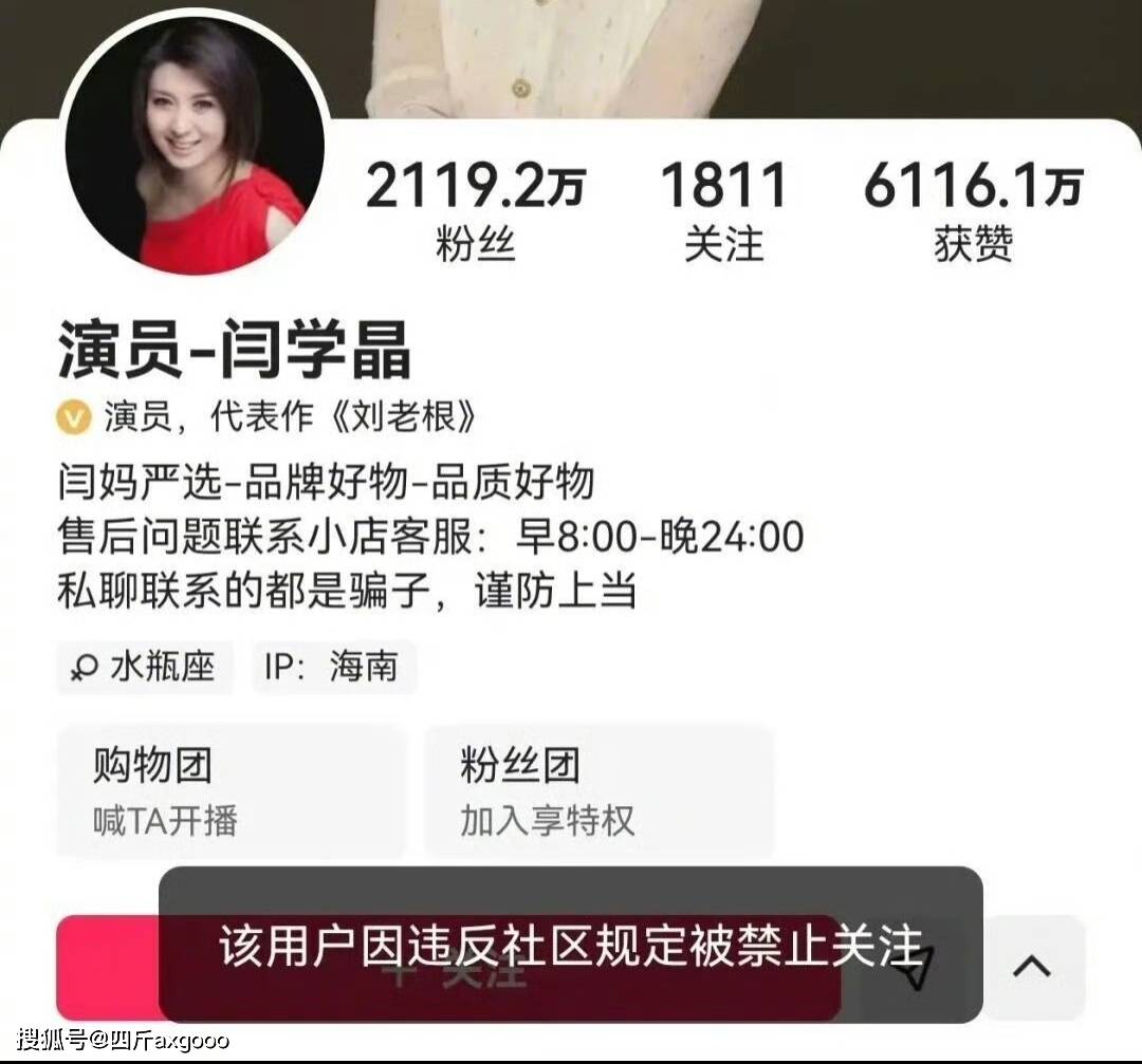 网友爆料,闫学晶在多家短视频平台的账号被挂上“禁止关注”的提示。