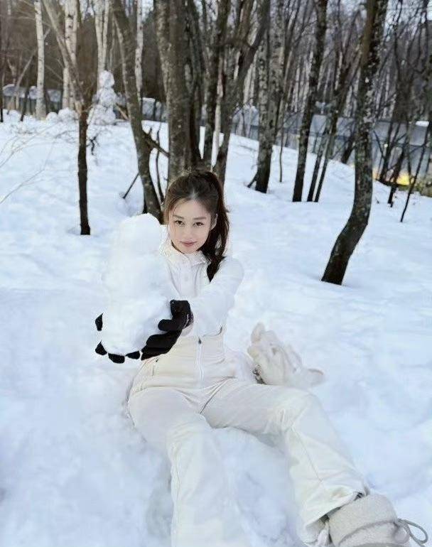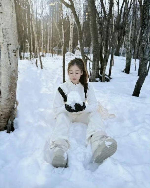 岑丽香置身于一片雪地中,她戴着手套捧起一个大雪球,看起来玩心大发,照片的视角似乎来自她老公,若真是如此,还真的要盛赞一下男方的拍摄技术。
