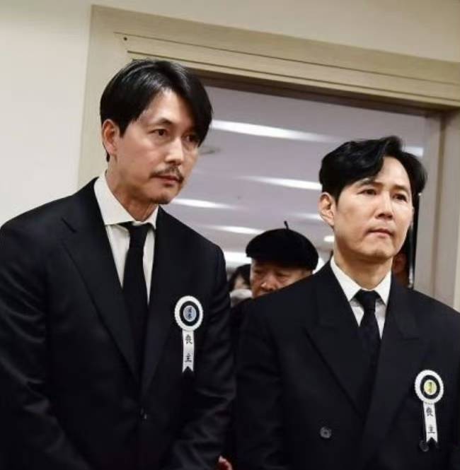 葬礼现场,李政宰、郑雨盛这两位顶尖影帝行跪拜礼,然后手捧安圣基的遗像,神情肃穆地守在灵堂前。