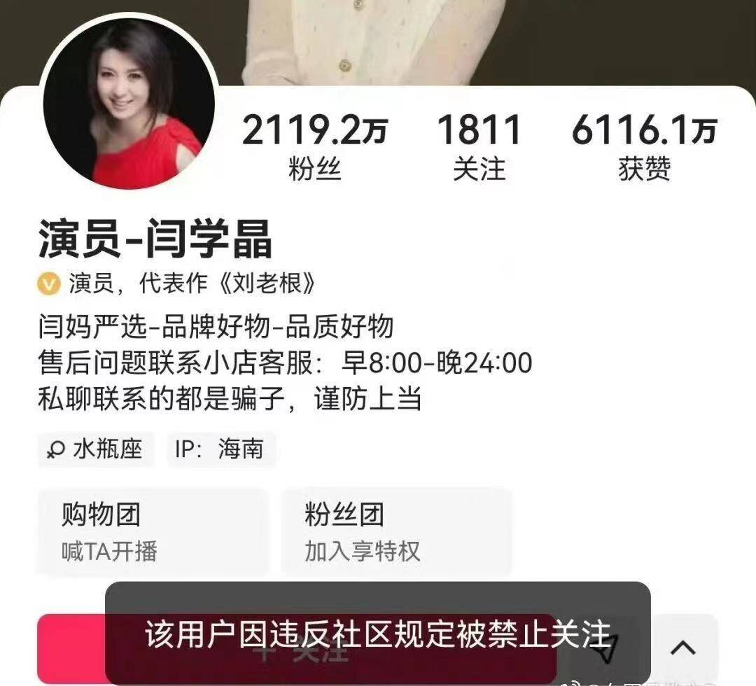 演员闫学晶的多个平台账号被禁止关注,包括抖音、快手等,闫学晶“哭穷”引爆网络热议,她疑似被网友抵制代言产品,代言品牌 已经多天没有直播。