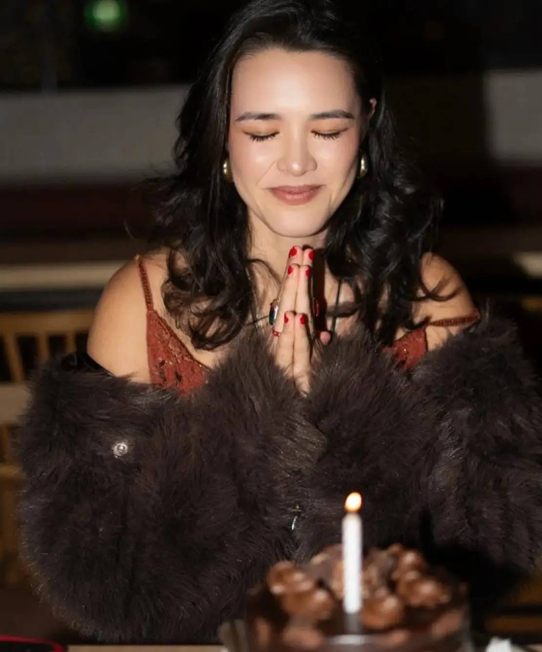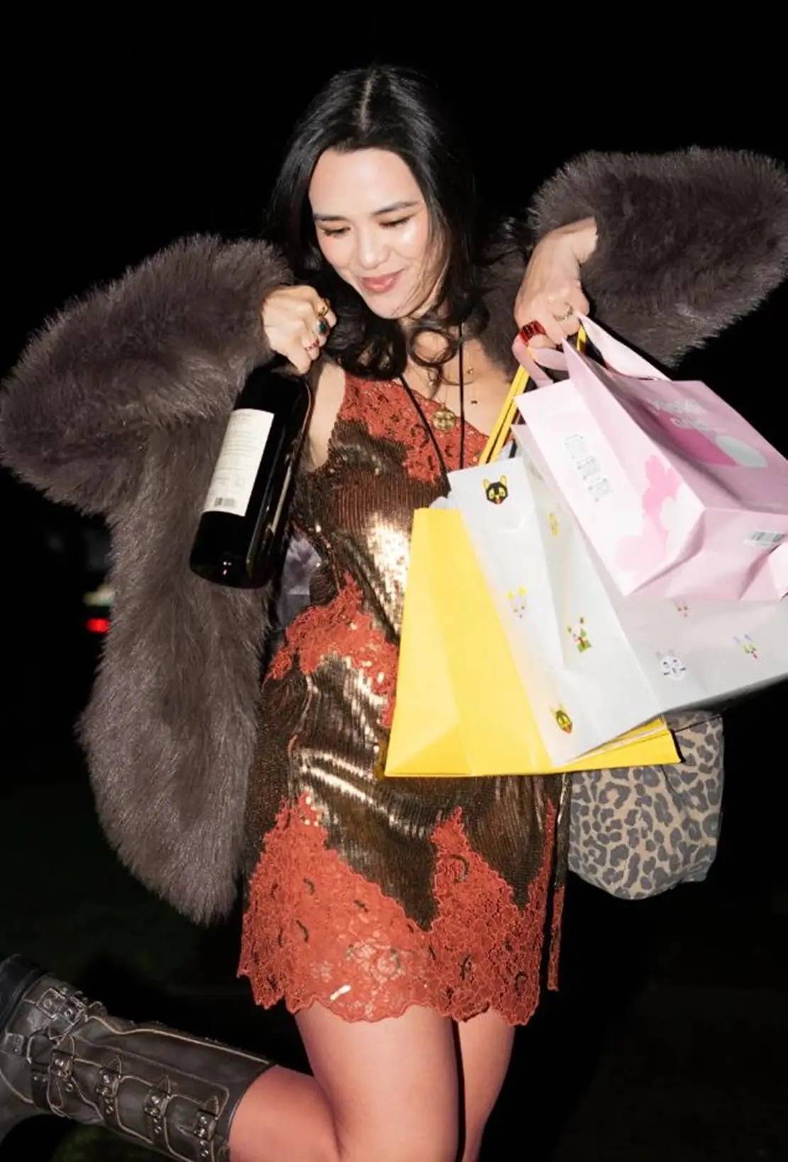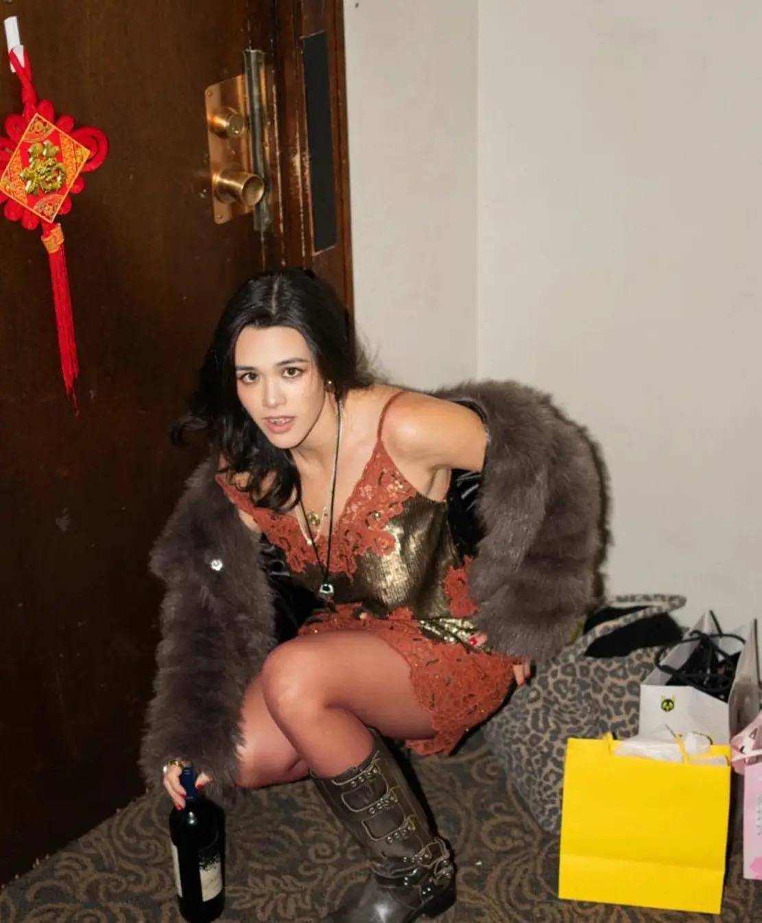 一条吊带裙、搭配了棕色皮草外套,就像贵夫人一样。28岁的年纪、打扮成这样,比48还显老。可能这就是东西方的审美差距吧。