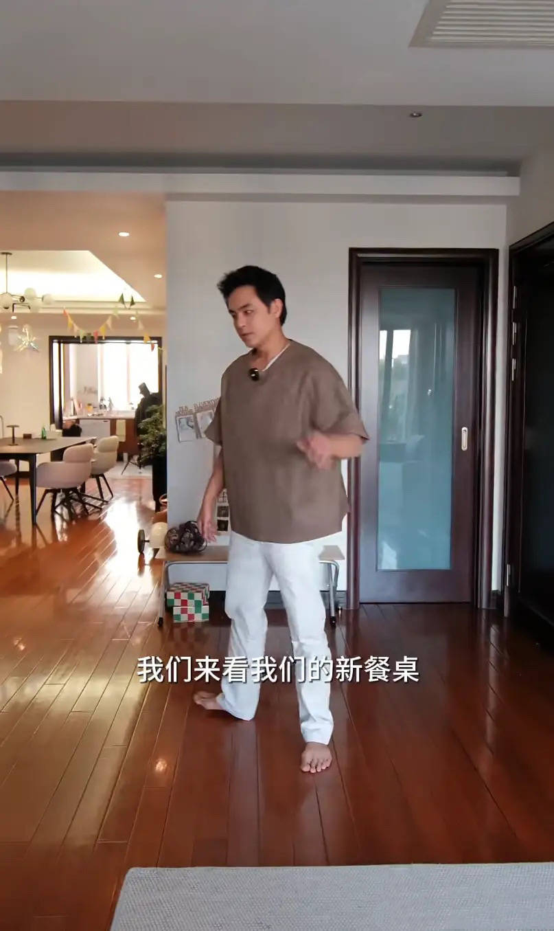 视频中,明道向大家介绍自己装修的新家。他穿着棕色上衣、白色裤子、还光着脚丫,室内很暖和。