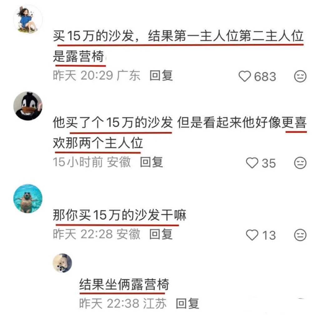 尤其是15万的沙发摆在那里,明道更喜欢做的主人位是两把露营椅。咱就说直接摆一排露营椅不就好吗?还买什么沙发。
