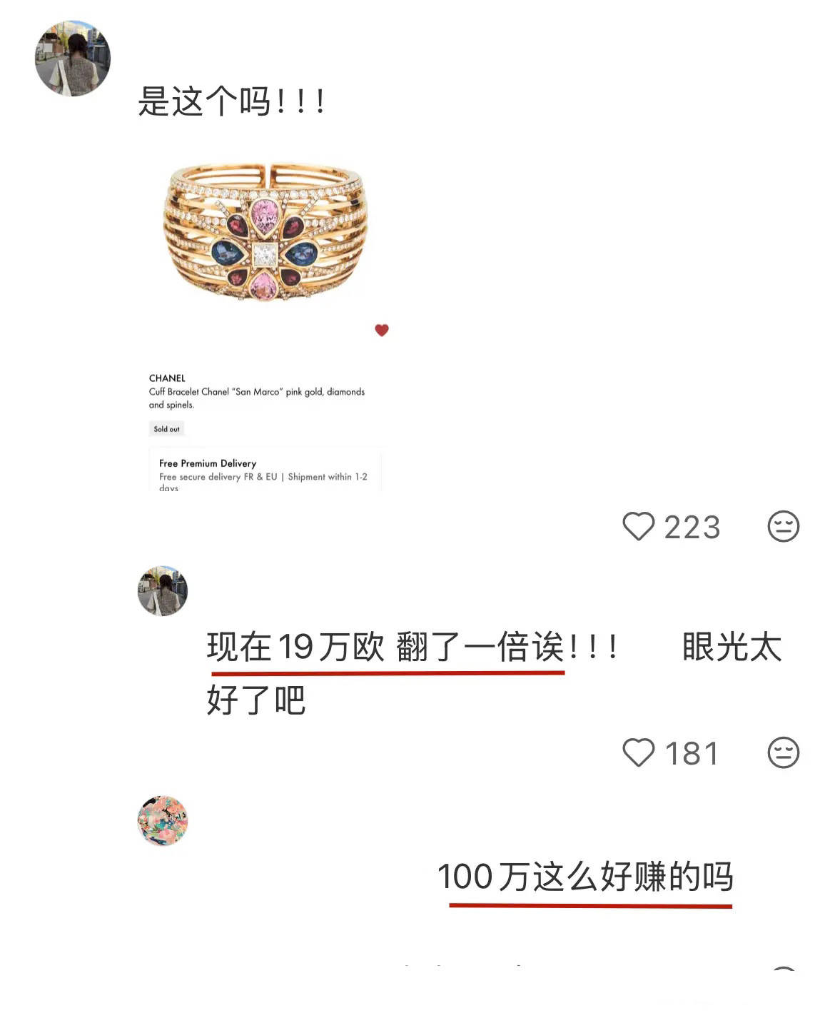 重点是,这只镯子还升值了。买的时候11万欧,现在是19万欧,足足赚了接近100万。难怪说有钱人会越来越有钱,穷人真是赚不到认知以外的钱。