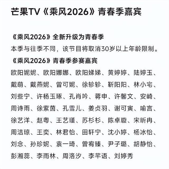 有爆料称,新一季《乘风2026》=将聚焦20岁左右艺人,拟邀45位选手平均年龄约20岁,旨在吸引年轻观众。