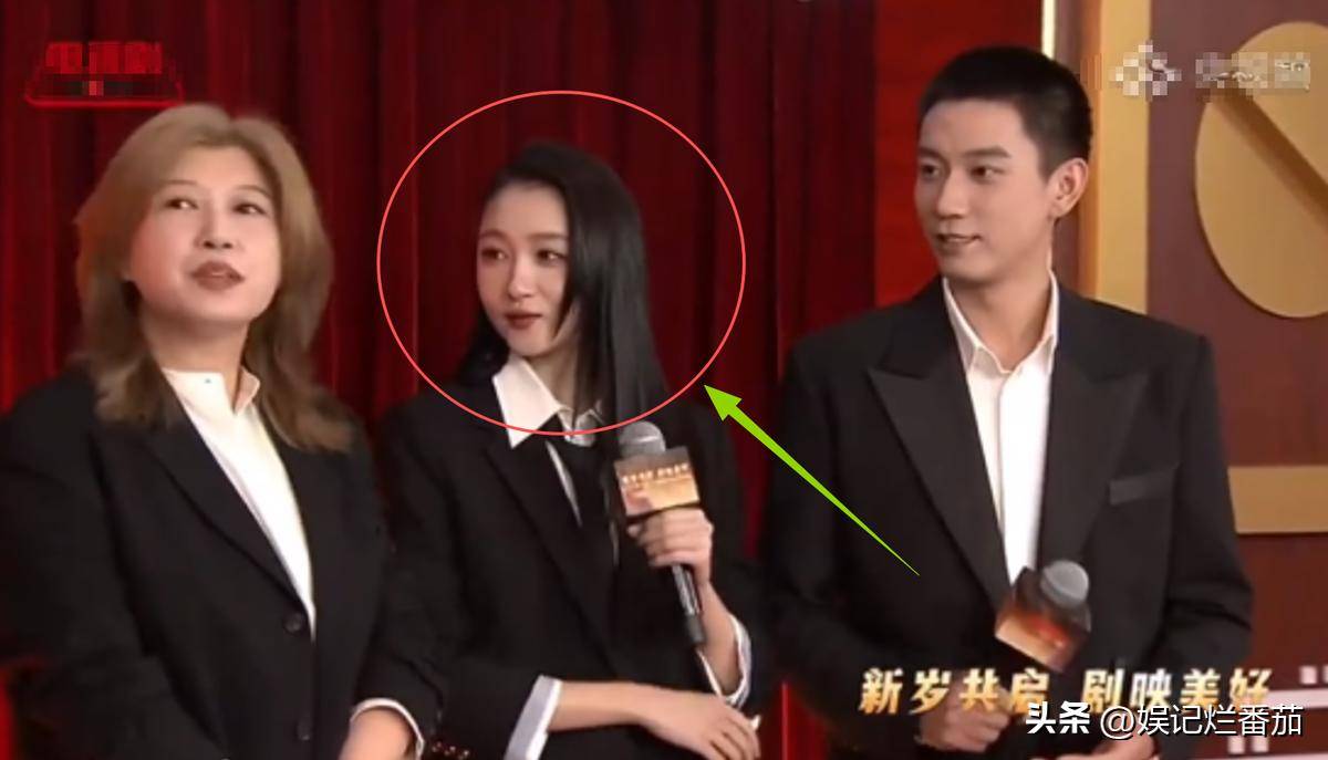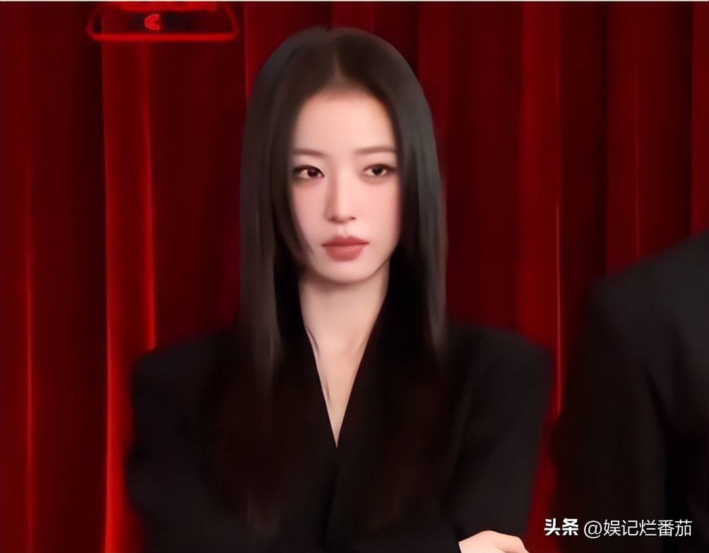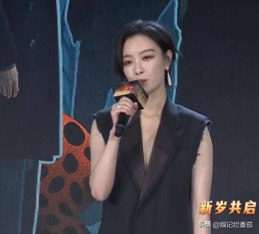 央视的镜头下,三七分的发型、黑色的西装、暗色的口红,衬托的脸好肿,认不出的那种。