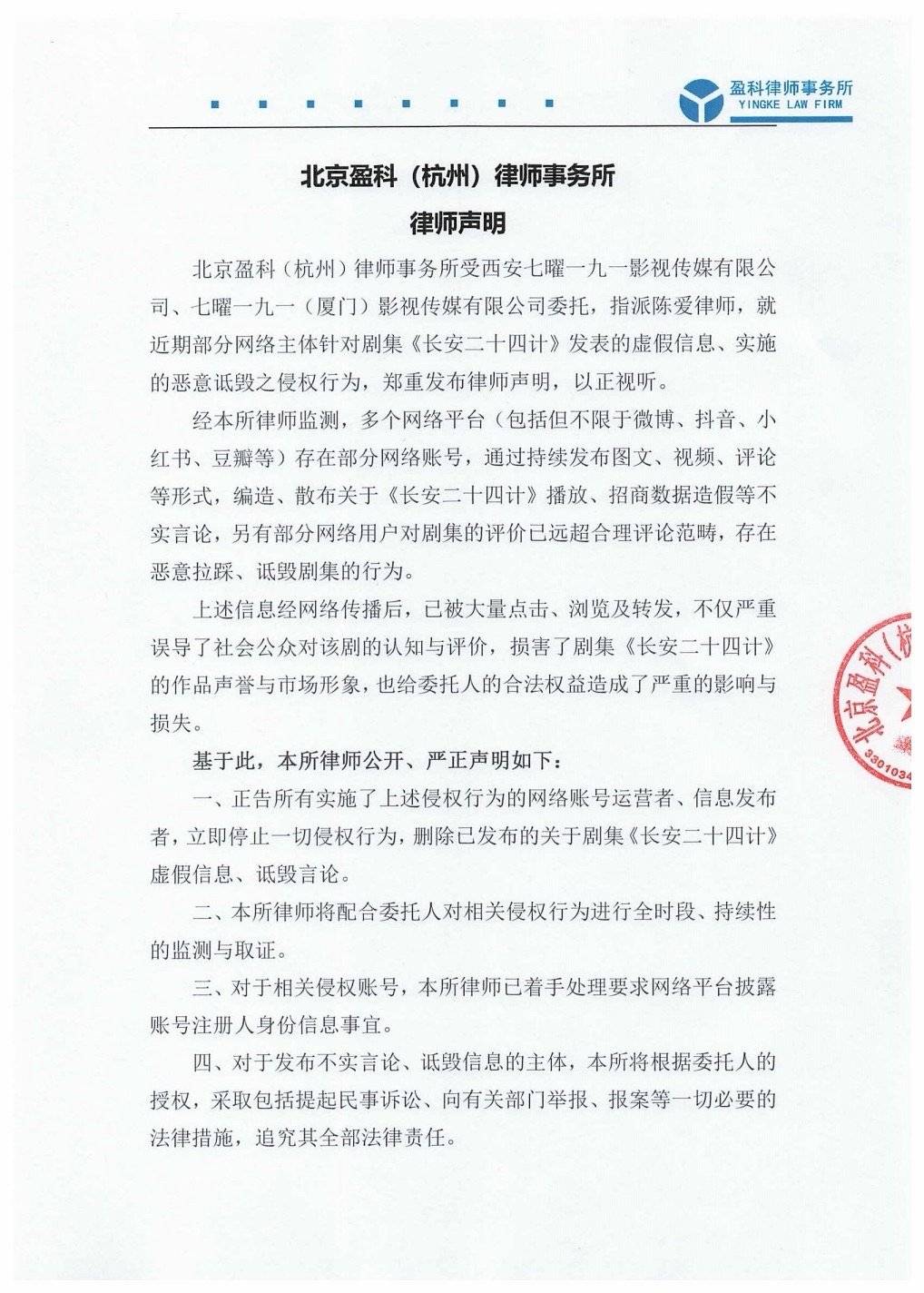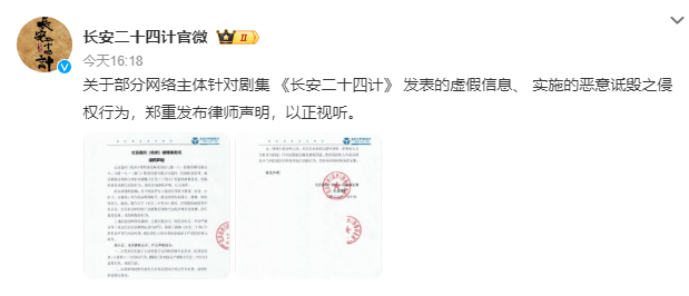 10日,《长安二十四计》官方账号发布律师声明维权,并配文称:“关于部分网络主体针对剧集 《长安二十四计》 发表的虚假信息、 实施的恶意诋毁之侵权行为,郑重发布律师声明,