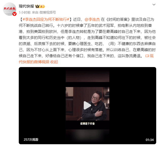 (来源:现代快报)近日,李连杰在《时间的答案》里谈及自己为何不断挑战自己转行。十六岁的时候拿了五年的武术冠军,拍电影从内地拍到香港,拍到美国拍到欧洲,但是李连杰转舵是为了要