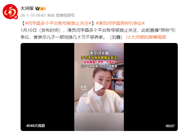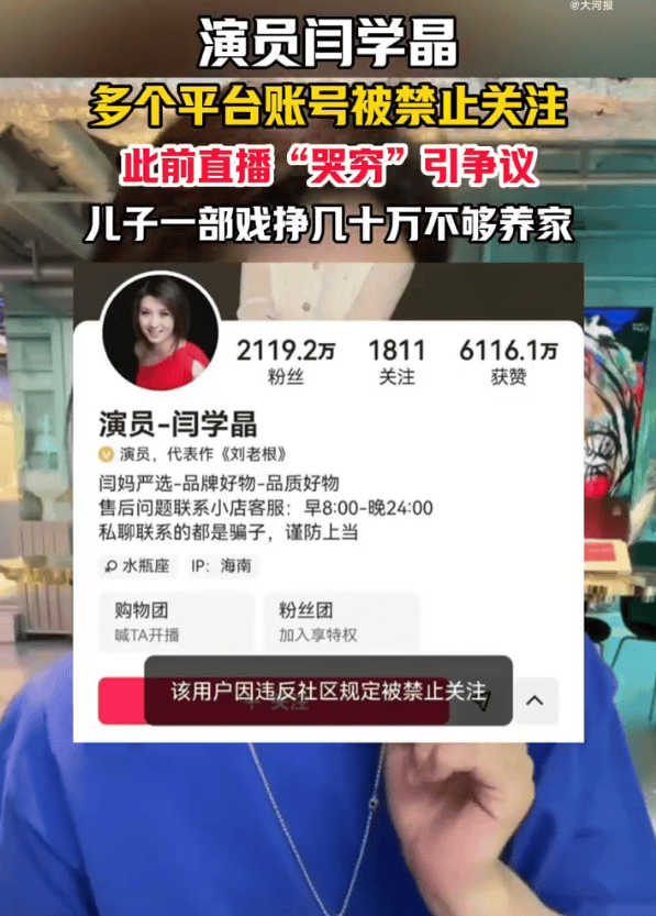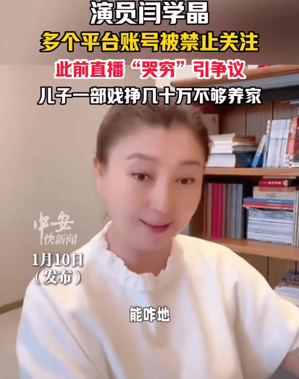 (来源:大河报)1月10日(发布时间),演员闫学晶多个平台账号被禁止关注,此前直播“哭穷”引争议,曾表示儿子一部戏挣几十万不够养家。据悉,闫学晶曾在直播中透露儿子一家收入