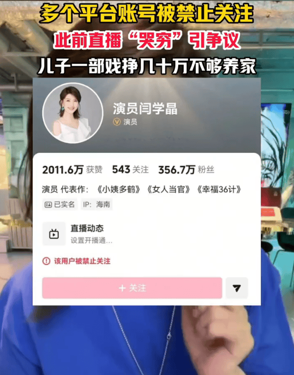 1月10日(发布时间),演员闫学晶多个平台账号被禁止关注,此前直播“哭穷”引争议,曾表示儿子一部戏挣几十万不够养家。