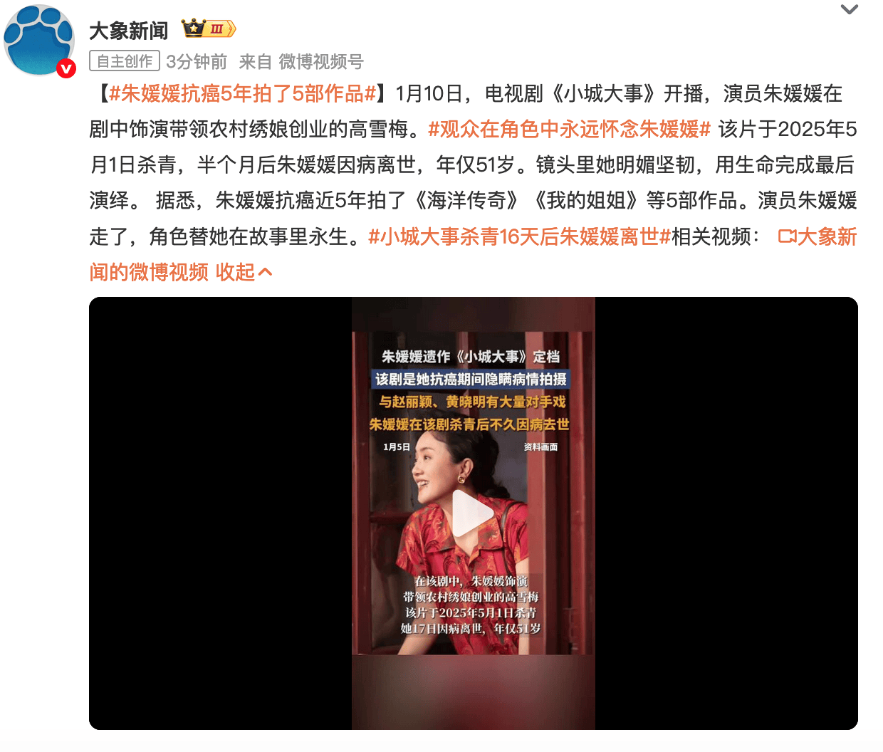 1月10日,电视剧《小城大事》开播,演员朱媛媛在剧中饰演带领农村绣娘创业的高雪梅。该片于2025年5月1日杀青,半个月后朱媛媛因病离世,年仅51岁。镜头里她明媚坚韧,用生命完成最后演绎。 据悉,朱媛媛抗癌近5年拍了《海洋传奇》《我的姐姐》等5部作品。