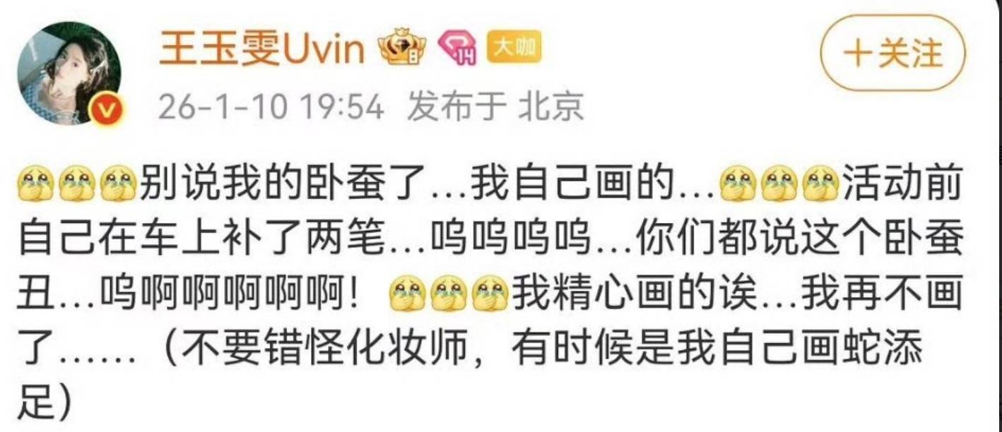 近日,在时尚活动中王玉雯的妆容因"突兀大卧蚕"被部分粉丝质疑。她发文表示这个卧蚕的妆容是自己的画的,并表示之后不会再画,她说:"卧蚕是我自己画的…你们都说丑…