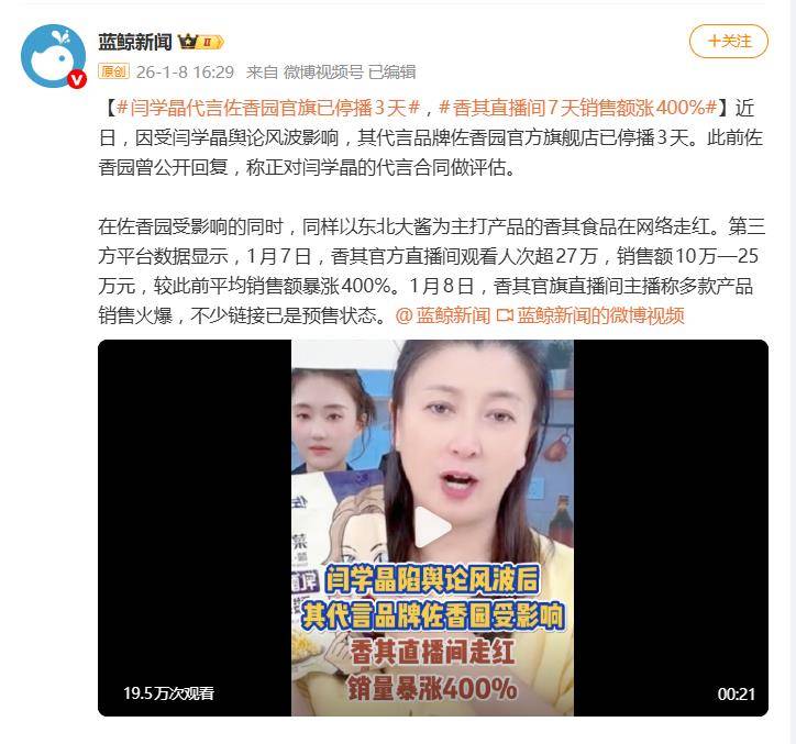 有意思的是,这场代言人“翻车”事件,意外搅动了调味品江湖的格局。就在佐香园焦头烂额之际,同样主打东北大酱的竞争对手“香其食品”却在直播间迎来了泼天流量。第三方数据显示,1月7日,香其直播间观看人次暴增,销售额较平日飙升400%,多款产品卖到预售。这戏剧性的一幕,被网友调侃为“一家塌房,全家吃饱”,一场无心的言论风波,竟演变成了实实在在的市场份额争夺战。