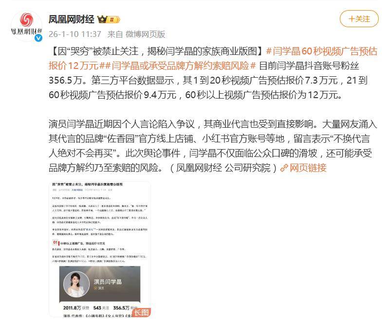 而处于风暴中心的闫学晶,损失可能才刚刚开始。拥有超过356万抖音粉丝的她,商业报价不菲,一条短视频广告报价最高可达12万元。此次事件不仅导致其公众口碑滑坡,更直接丢掉了重要代言。根据行业惯例,因艺人自身不当言论导致品牌受损的解约,艺人方很可能还需面临品牌方的索赔要求。这真是“一句话,几十万(收入)可能真不够赔的”。