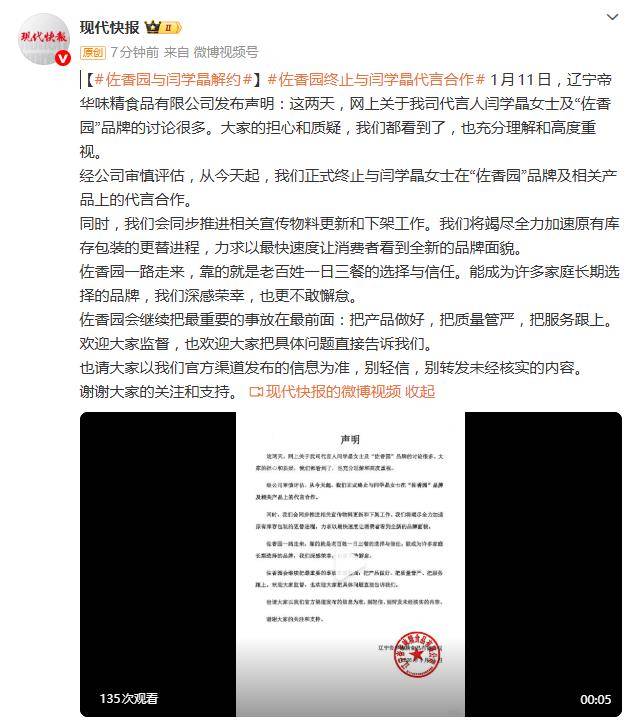 一句关于“北京家庭开销”的感慨,让演员闫学晶的代言事业瞬间“翻了车”。1月11日,辽宁帝华味精食品有限公司一纸声明,正式宣布终止与闫学晶在“佐香园”品牌上的所有代言合作,为这场由个人言论引发的品牌危机按下了“止损键”。