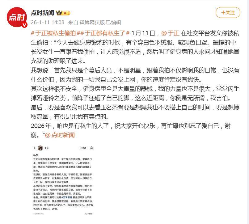 1月11日,知名编剧、制作人于正的一则发文,在社交平台投下了一颗略带荒诞的“炸弹”。他自曝在健身房被一名“私生饭”冒充助理尾随偷拍,并以一句“2026年,咱也是有私生的人了”的自嘲收尾,瞬间点燃了网友的围观与争议。