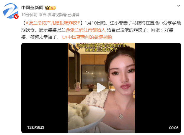 1月10日晚,汪小菲妻子马筱梅在直播中分享孕晚期饮食,展示婆婆张兰给自己投喂的炸饺子。网友:好婆婆,筱梅太幸福了。