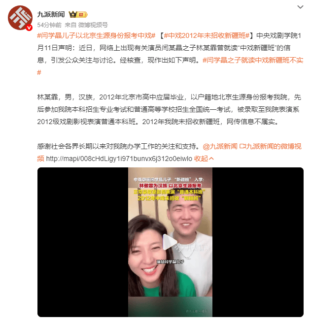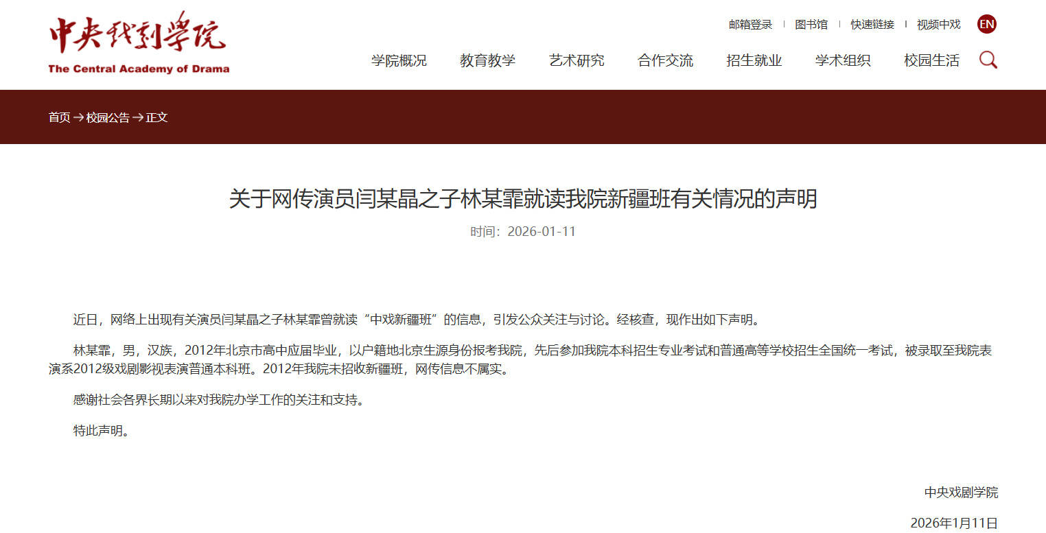 中央戏剧学院1月11日声明:近日,网络上出现有关演员闫某晶之子林某霏曾就读“中戏新疆班”的信息,引发公众关注与讨论。经核查,现作出如下声明。
