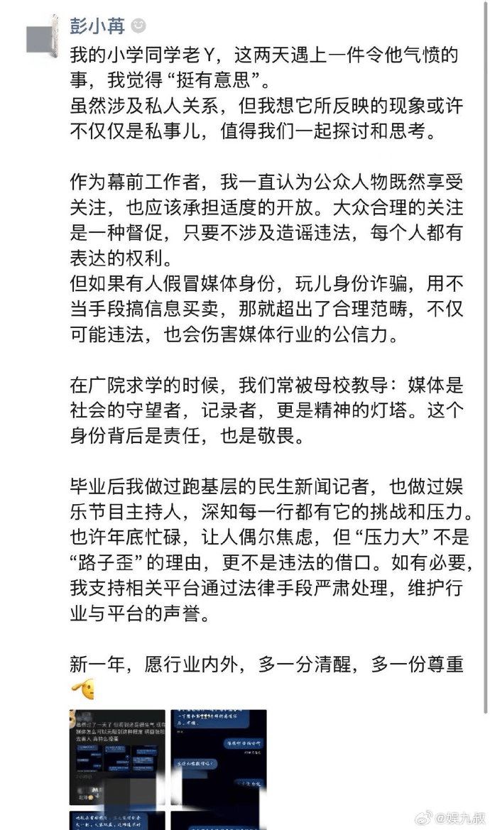 彭小苒发文强调,公众人物接受合理关注,但冒充媒体身份进行信息交易已涉嫌违法,不仅突破道德底线,更损害媒体公信力。她援引母校中国传媒大学"媒体是社会的守望者"的教导,呼吁行业尊重职业伦理,并表态支持通过法律手段维权 。