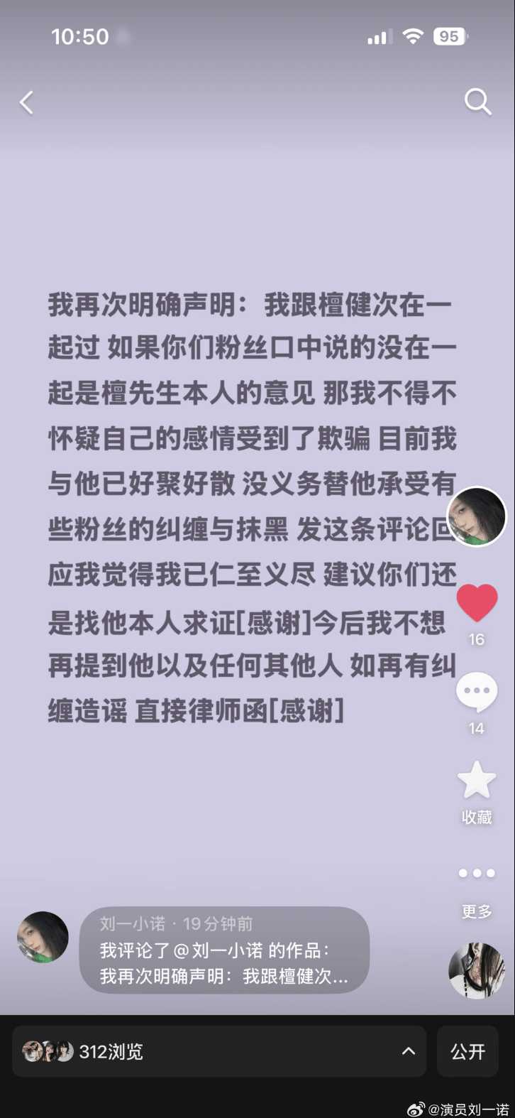刘一诺的声明时间与《轧戏》开播高度重合,她被指利用绯闻引流;她自称"柏拉图式恋爱"(无肢体接触)却主动展示暧昧礼物,逻辑难以自洽。