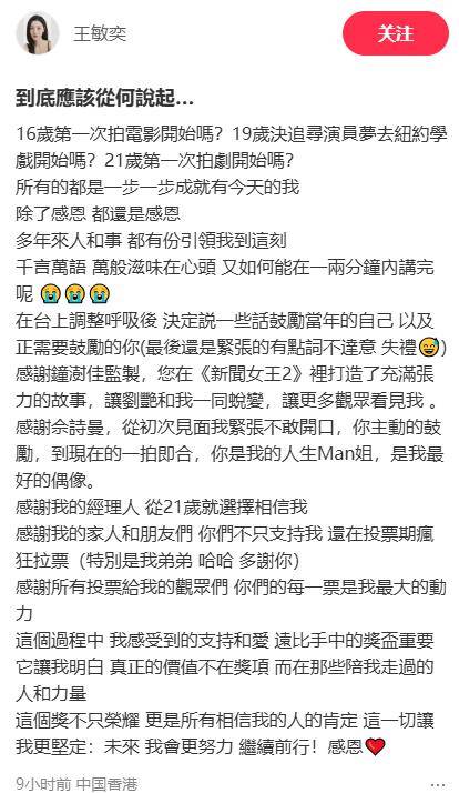 而在她官宣拿奖后,又陷入到了关系户风波中,虽然她火速发文写了一段获奖感言,感言内容全在暗示自己有多努力、多受教。