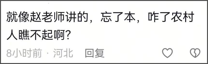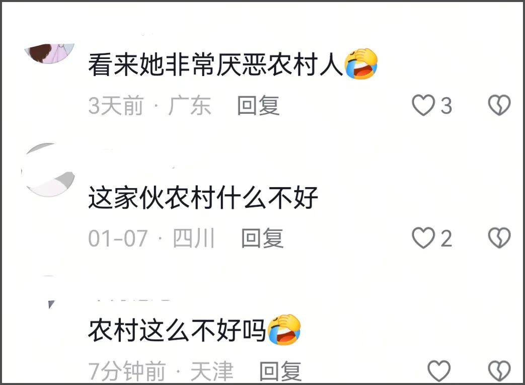 此话一出遭到网友疯狂吐槽,认为她飘了,看不起农村人,一句话就暗示阶层。