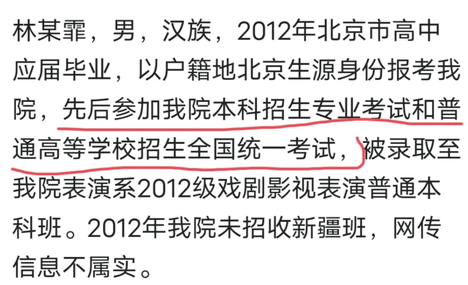 查一下当年中戏入取分数线和林某当年的高考成绩就知道了,或拿出来当年的录取通知书。 不是招收的新疆班,是以新疆的户口进的中戏 占有了新疆一个,应该入学有才华孩子的名额,中戏说没招新疆班,究竟谁在说谎,都拿出实锤证据,不是拿不出来,我看是不敢拿出来吧,