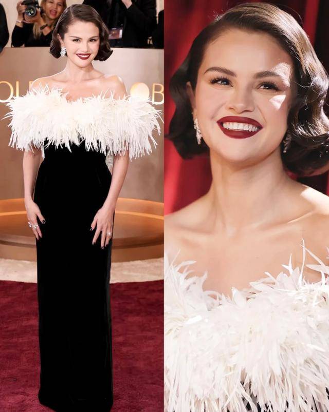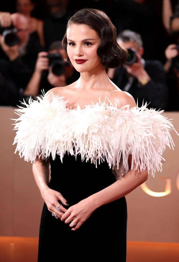 Selena穿的那件香奈儿黑色礼服格外抢镜,复古妆发让她看起来格外有韵味,完美复刻了好莱坞黄金年代的女星风采。