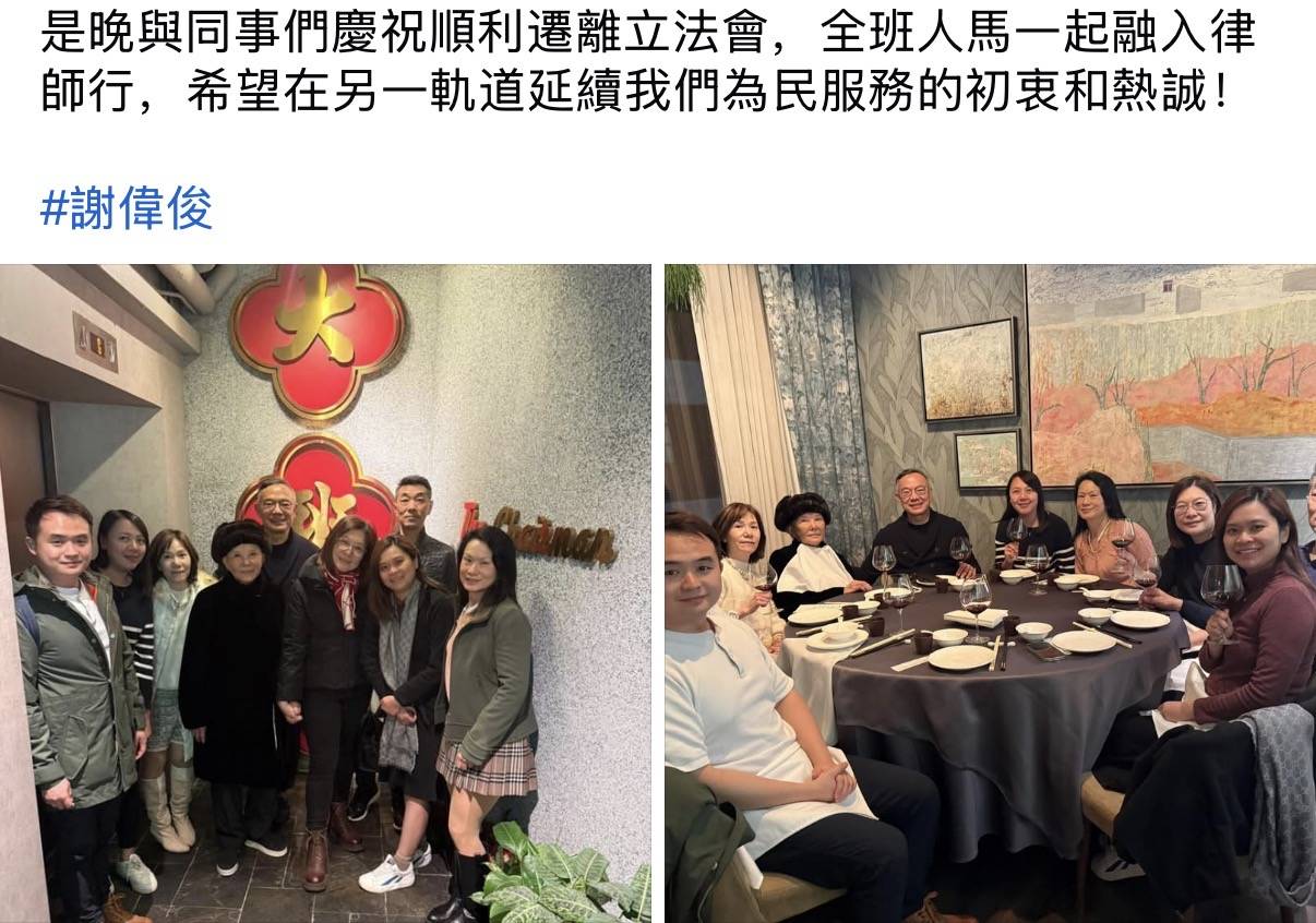 谢伟俊与一众同事吃新年饭,晒照之余他还留言表示,晚上与同事们庆祝顺利迁离立法会,全班人马一起融入律师行,希望在另一条轨道上延续为人民服务的初衷与热诚。谢伟俊在2025年宣布不再竞逐议员连任,这也就意味着他要离开立法会,而以他当下的年纪,以及个人的资产,他完全可以退休回家,陪伴白韵琴安稳地过完余生,不过如此一来,这些共事多年的同事可能就会面临失业的风险。显然,谢伟俊是深思熟虑过的,于是他决定重拾律师这个职业,并且带着昔日的同事一起融入律师行,开启新的赛道。