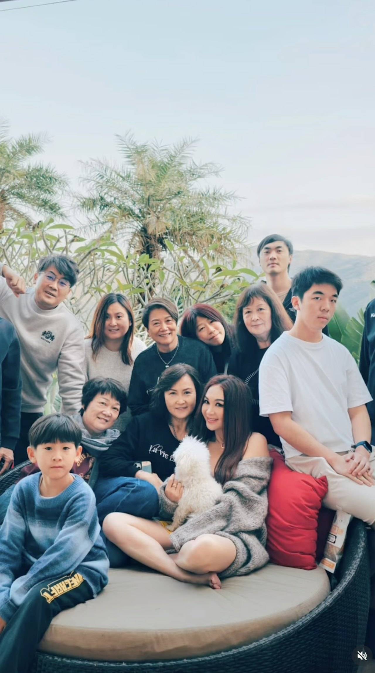 一家人除了在室内合照,还在豪宅的花园喝酒闲聊。温碧霞一边喝着红酒,一边与姐姐们聊天,很愉悦。而当天天气应该也不算冷,她穿了短裙,披了一件毛线衫,合照的时候还露出了肩膀。一大家子的人在户外合照,温碧霞抱着狗坐在中间,成为焦点所在,养子穿着白色T恤靠在她所坐的沙发的扶手上而在温碧霞周边以及身后的都是姐姐们以及姐姐的孩子、孙子们,也是三代同堂的场面了。一家人罕见同框,合照中没看到温碧霞的丈夫,实际上何祖光也在场,在夫妻的单独照片中,就看到了他的身影。