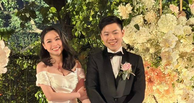 新郎李天耀则穿上经典的西装套装,头发用发蜡打理得非常完美。两人手牵手一起出场,引发全场热议。