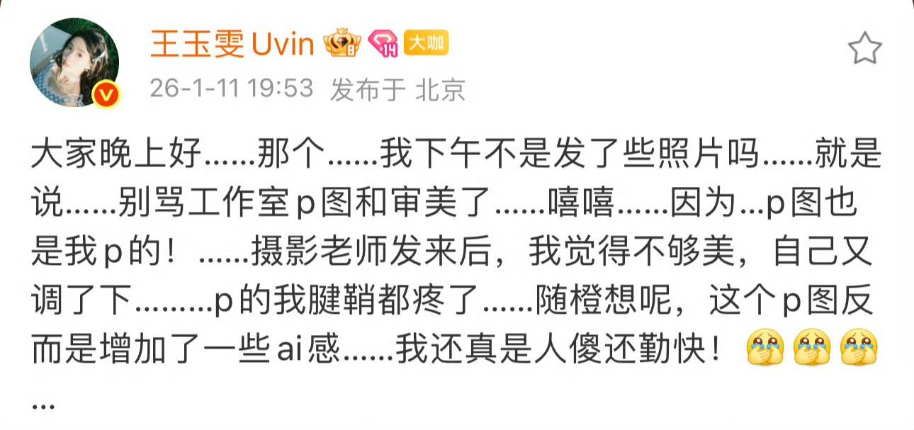 谁能想到,第二天她又来一波"主动认错"。工作室发布的活动宣传图被吐槽"修得太假""AI感过重",五官失真得像游戏建模。正当大家猜测是不是修图师偷懒时,王玉雯又双叒叕站出来认领责任:"别骂工作室了,图是我自己P的!"她解释自己看摄影师原图觉得"不够美",就亲自上手精修,修到"腱鞘都疼了",还自嘲"人傻还勤快",调侃自己确实给照片加了点AIbuff。
