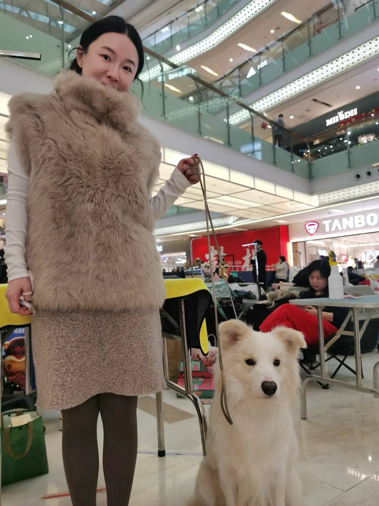 当天霍思燕穿了一件白色打底衫、浅棕色的皮草马甲,看着非常富态。她把西施犬抱在怀里,脸贴脸很亲密。
