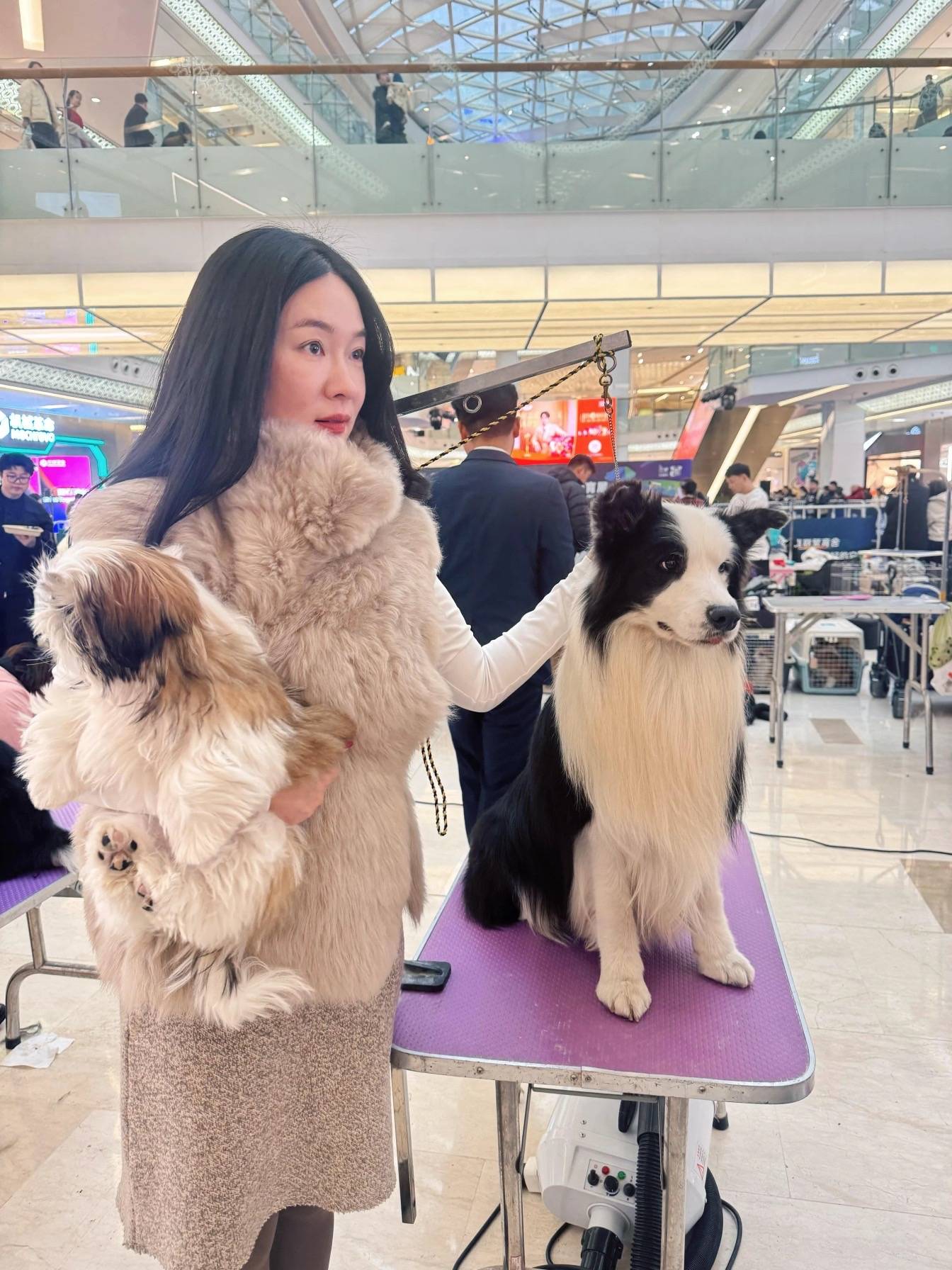 头发挽成一个发髻,带着浅粉色的头花,有一种很优雅又知性的美。她养狗不是单纯的照顾吃喝,而是带它们见世面、配它们一起成长。