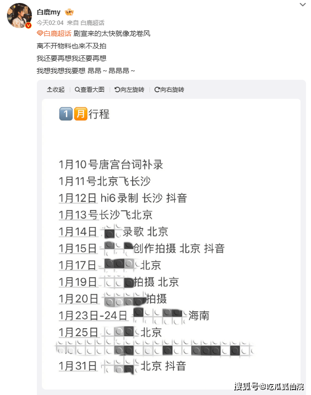 近日,白鹿在深夜突然发文,曝光了自己一月满满的行程安排,瞬间引发粉丝们的热烈关注与讨论。从行程表中可以清晰看到,围绕《唐宫奇案》的剧宣工作成为本月重点,同时还有 hi6 录制、录歌、拍摄以及创作拍摄等多项事务,整个一月可谓是被各类工作塞得满满当当。