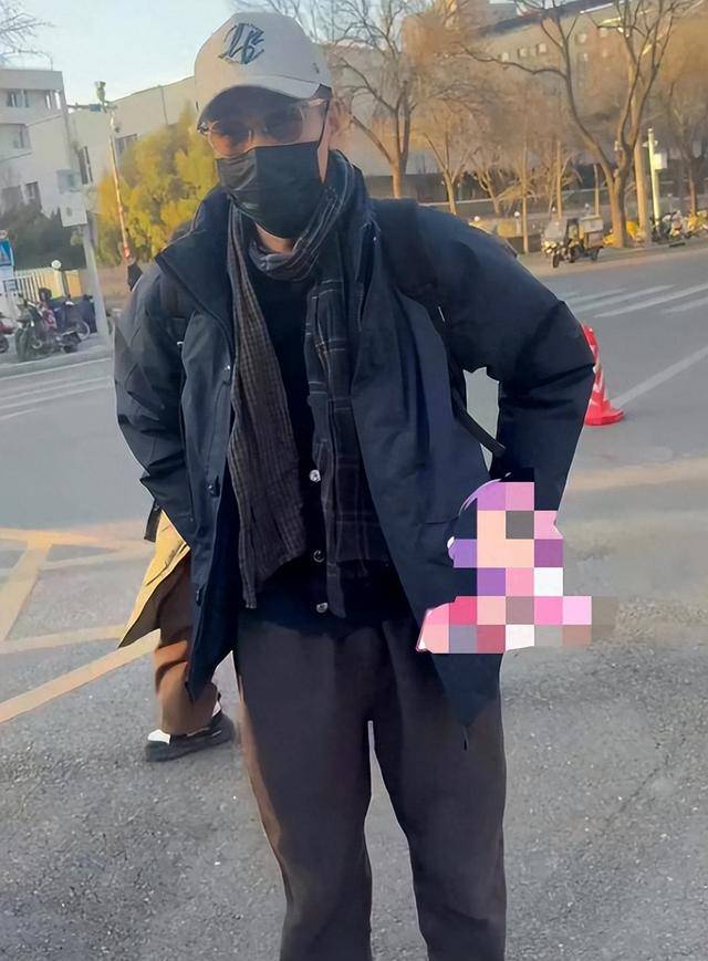 53岁的辛柏青裹着那件深蓝色的棉服外套,内搭深蓝色开衫,下身搭配咖色呢子裤,脚上是一双白色单鞋。