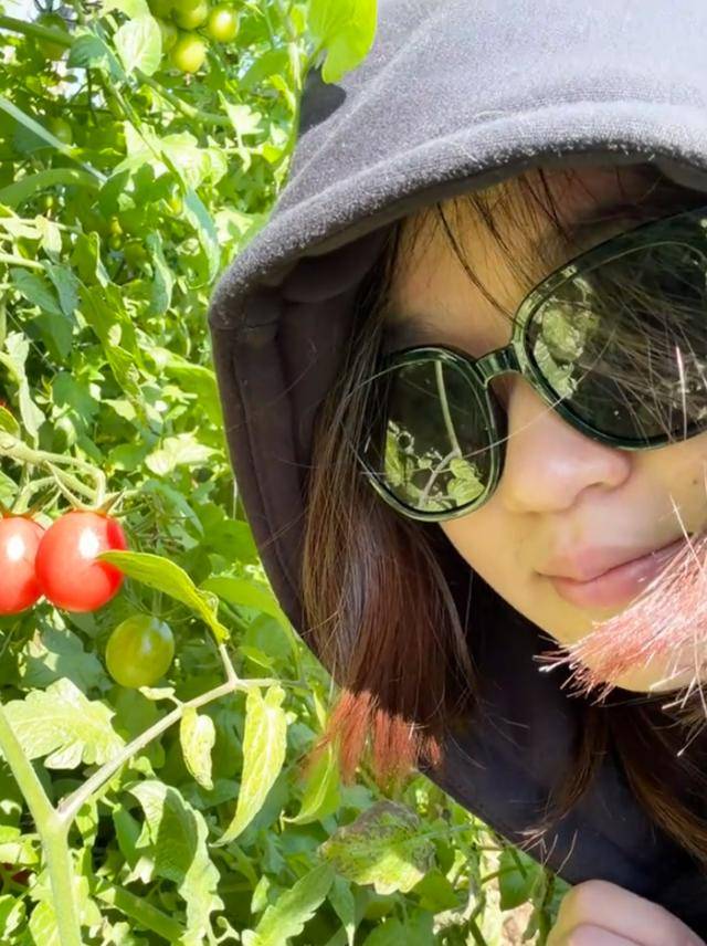 旁边的圣女果藤上挂着两个大小一样的果子,她特意停下来拍照,还开心地说“看着都开心”。