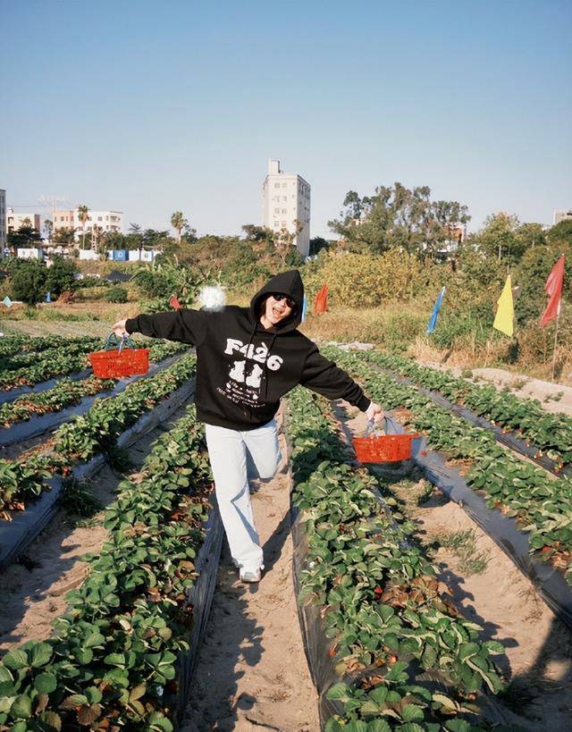 视频里的她完全没了赛场的紧张感,穿着简单的白裤子白鞋,肩上挎着两个小菜篮,在草莓地里穿梭。