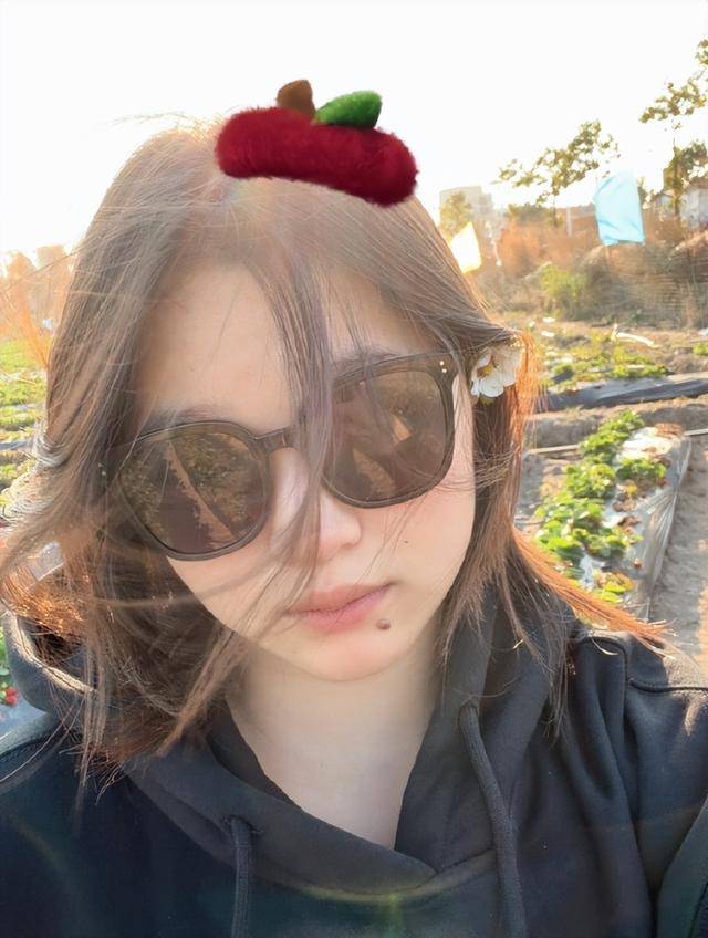 熟透的草莓红得发亮,她弯腰采摘时嘴角一直上扬,摘到满意的果子就对着镜头大笑,眼里全是光。