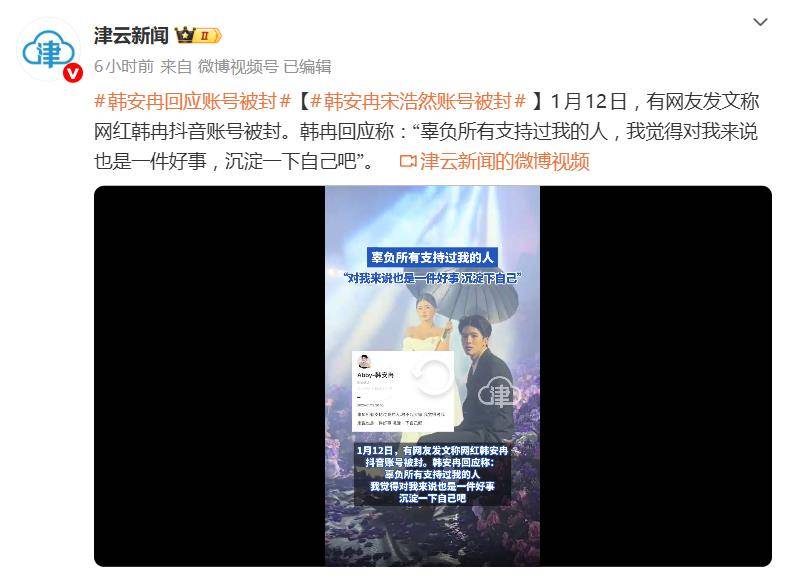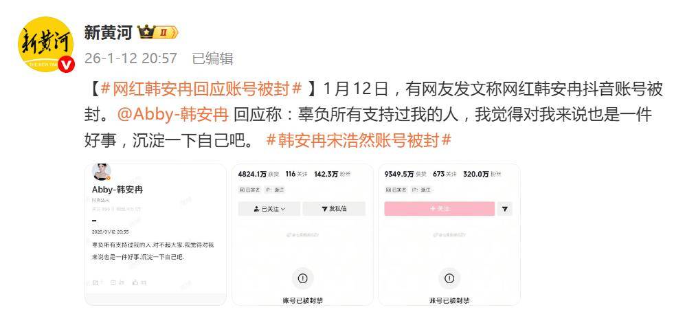 1月12日,一则“韩安冉抖音账号被封”的消息,再次将这位话题不断的网红推上风口浪尖。面对自己与前夫宋浩然合计超460万粉丝的流量入口被“一锅端”,韩安冉在微博的回应显得颇为“淡定”:“辜负所有支持过我的人,我觉得对我来说也是一件好事,沉淀一下自己吧。”