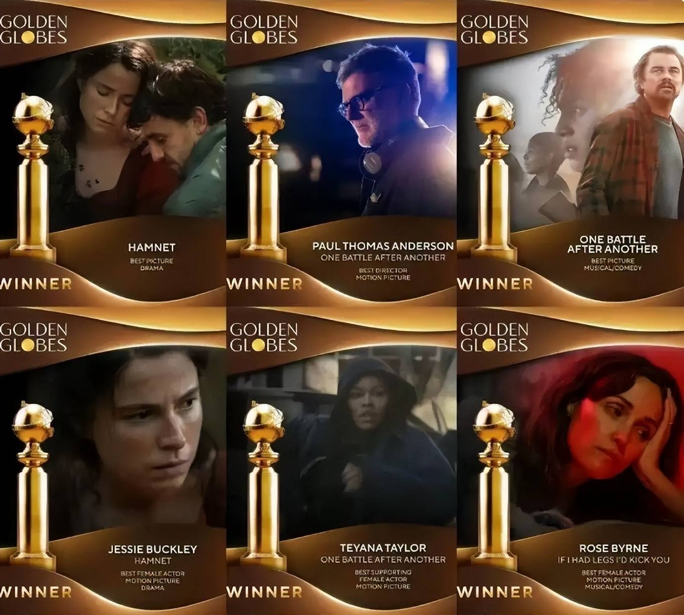 第83届美国电影电视金球奖完整获奖名单公布,《哈姆奈特》斩获最佳影片,《一战再战》获四项大奖,西·巴克利、萝丝·拜恩获得影后,“甜茶”提莫西·查拉梅、瓦格纳·马拉获得影帝。