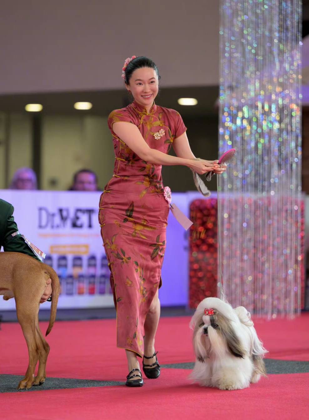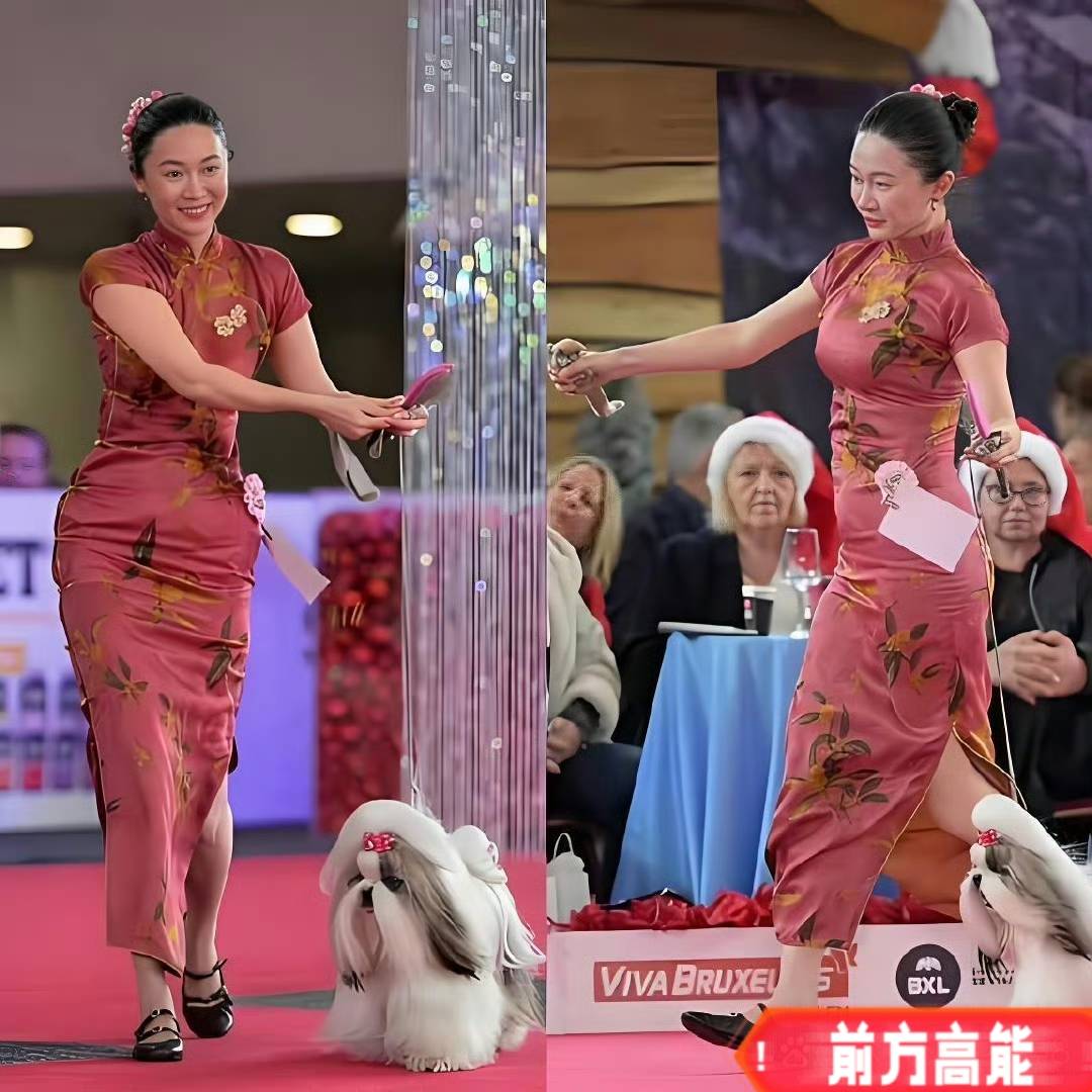 老外们可不知道霍思燕以前在中国是拍过《欢天喜地七仙女》的女明星,他们在场上看到的是:一个东方的女牵犬师,居然没有穿赛场上的职业装,而是穿着中国红的旗袍,在赛场上跑动着。