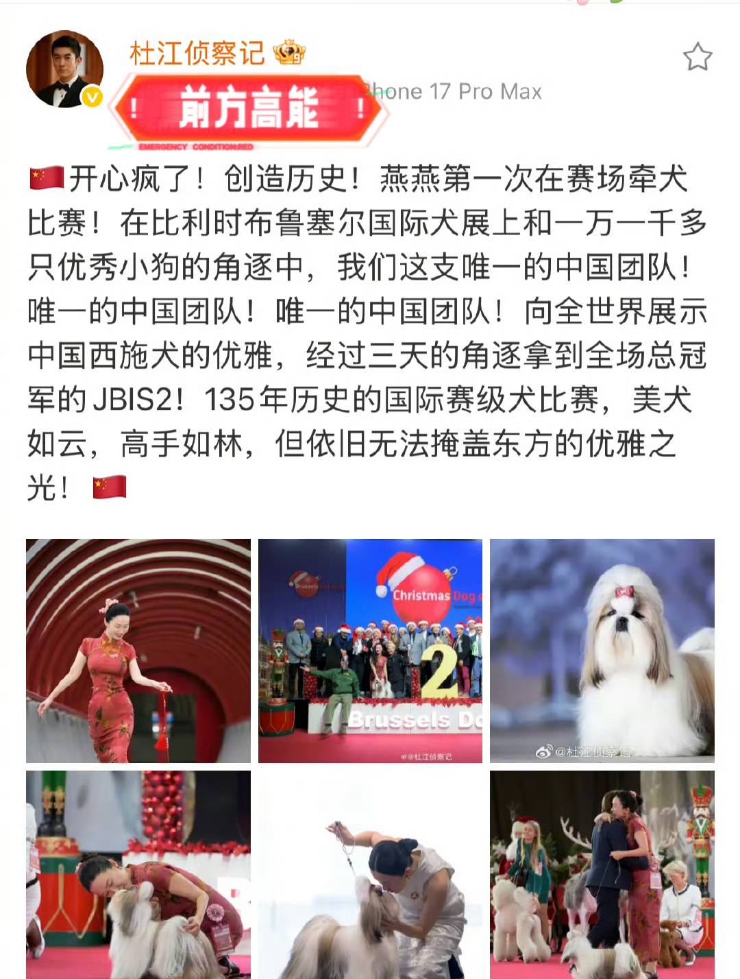 果然,在比利时的这次比赛中,霍思燕带着她的西施犬“太极”,站上了领奖台的巅峰——她拿下了青年组总冠军。