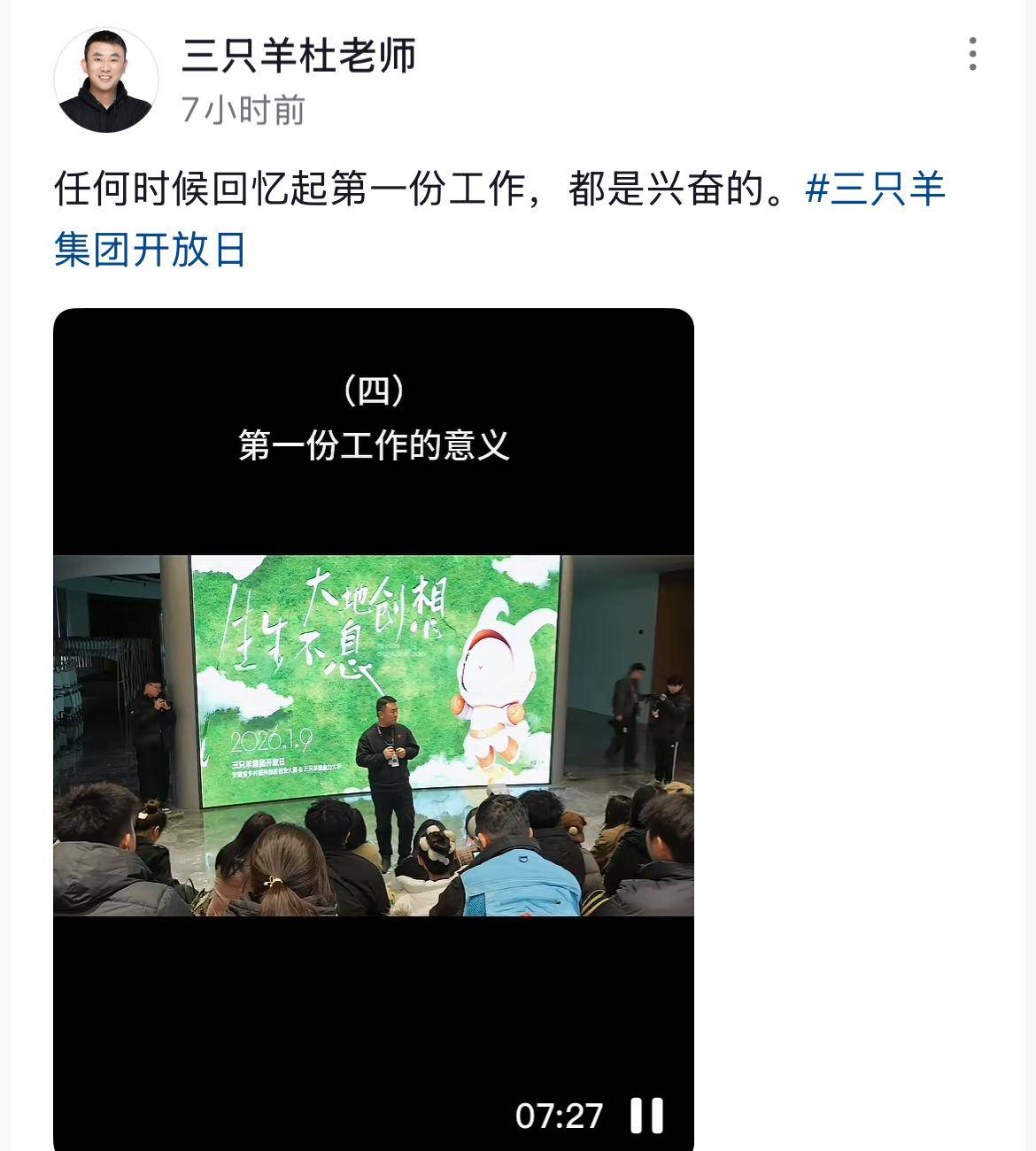 除了他们三人之外,三只羊的高层杜刚也有分享视频,并在公司内授课,讲述一些人生哲理,并透露,1月9号是三只羊集团的开放日。