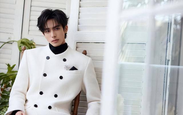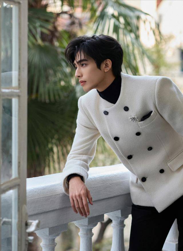 他身着白色双排扣西装内搭黑色高领毛衣,白色的西装干净利落,黑色的高领毛衣则增添了一份神秘和沉稳,两者搭配在一起,既有绅士风度又不失时尚感。