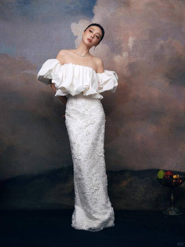 夸张的泡泡袖设计浪漫又富有戏剧张力,而下半身的蕾丝鱼尾裙摆则勾勒出完美曲线,将柔美与力量感平衡得恰到好处。
