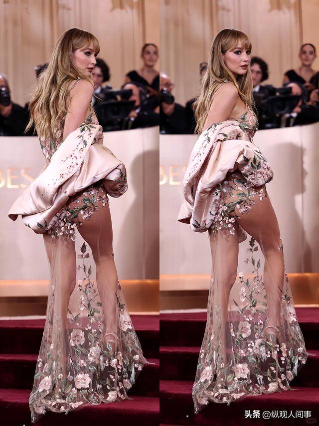 与她三年前在金球奖红毯上的粉色蓬蓬裙造型相比,此次的透视长裙更显大胆前卫,完美契合她如今在好莱坞的地位与自信。