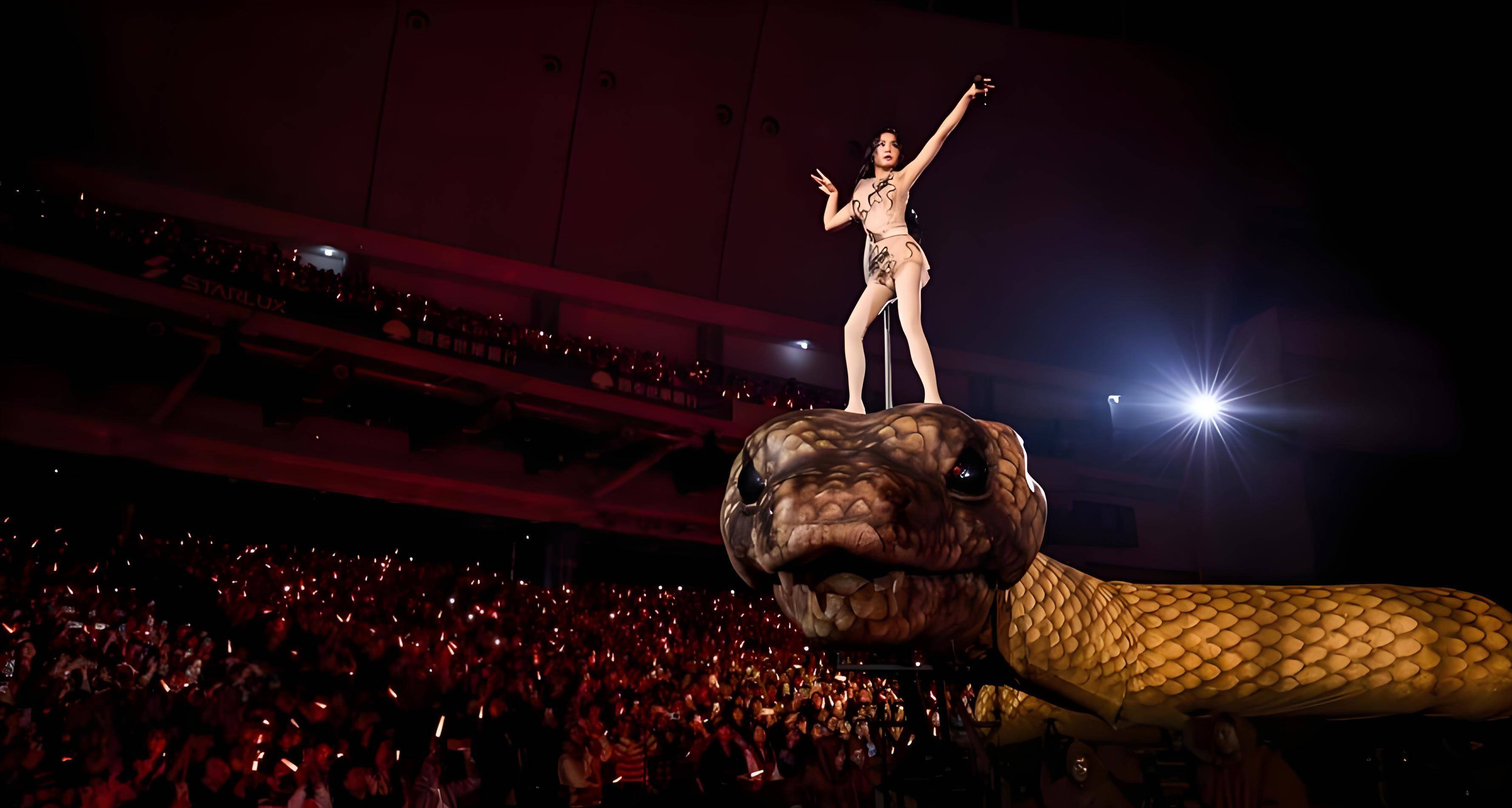 30米长的机械蛇、三层楼高的金色公牛,以及大量造型诡异的混合生物装置,仅制作和运输费用就花掉了1.7亿新台币。可现实很残酷——三场演唱会的总票房只有5.6亿新台币,里外一算,直接亏了3.4亿新台币,人民币约7000多万。